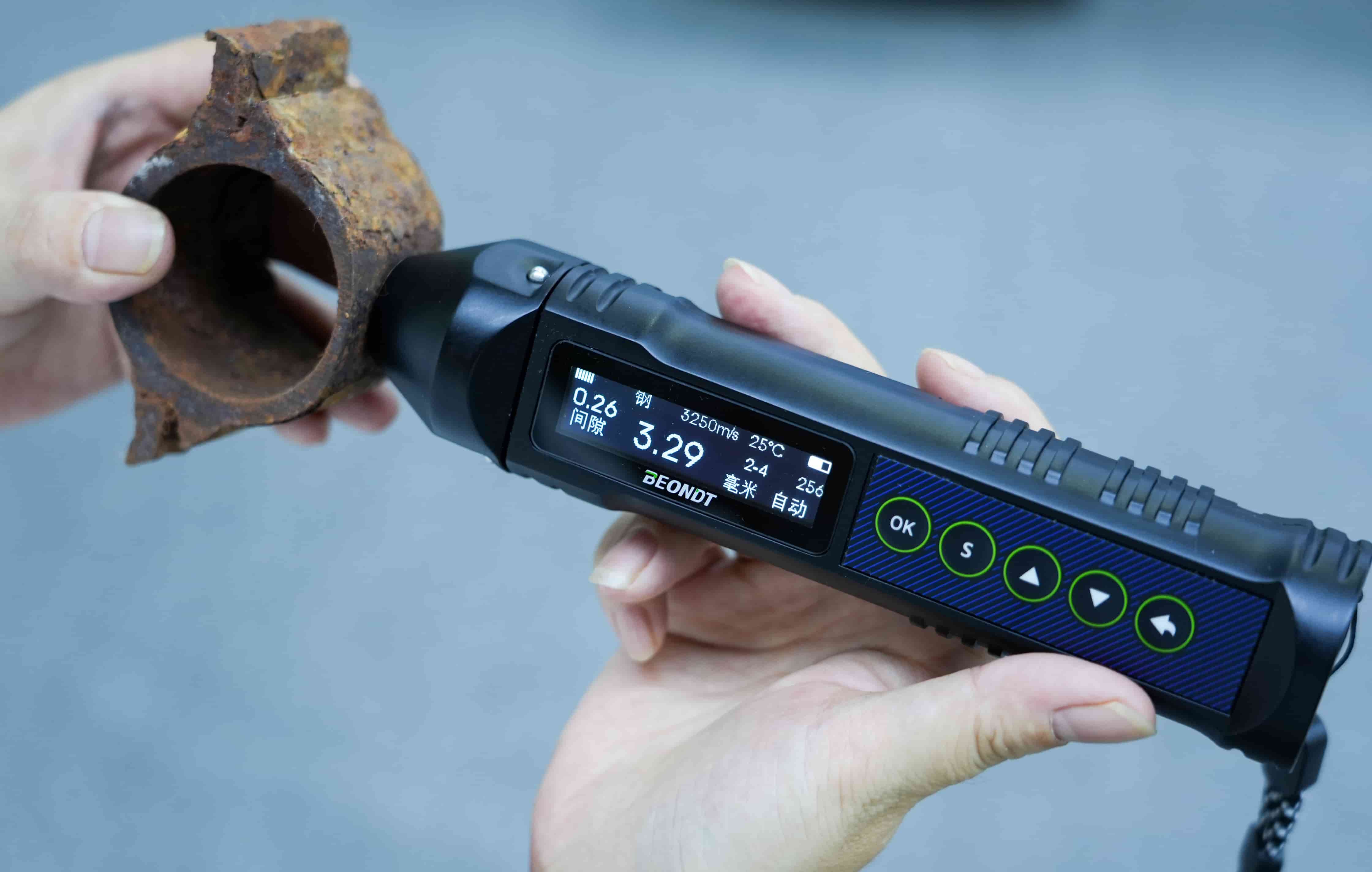 BEONDT EMA1900 electromagnetic ultrasonic high-temperature thickness gauge is specifically developed for measuring the thickness of steel pipes, rolled plates, bars, and other products made of steel, aluminum, and other metals. The working gap between the sensor and the metal can be as low as 4mm. Operation of the electromagnetic ultrasonic high-temperature thickness gauge does not require pre-cleaning of the surface or a coupling agent. The gap can be dirt, rust, salt deposits, or other non-conductive coatings (paint, varnish, enamel, plastic, etc.). In addition to measuring the thickness of metals, the EMA1900 can also measure the thickness of non-conductive coatings on metal workpieces. Thanks to its specialized sensor, the EMA1900 electromagnetic ultrasonic high-temperature thickness gauge can measure the thickness of metal workpieces heated to 800 degrees Celsius. This device employs a special data processing algorithm, enabling users to accurately measure the thickness of metal workpieces even in the presence of interference factors (such as metal anisotropy, the presence of multiple reflectors, and external interference). The built-in algorithm reduces the impact of human error on the test results and simplifies the device's interface.