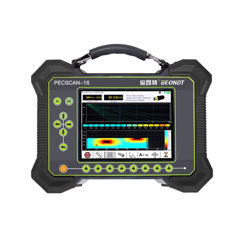 The system operates effectively even under galvanized steel cladding. It supports connection of up to 16 pulsed eddy current probes for simultaneous scanning, with flexible configuration options for fewer probes when needed. The device and sensors are housed in impact-resistant plastic casings with rubber protective padding. The display and main unit are protected by tempered explosion-proof glass.